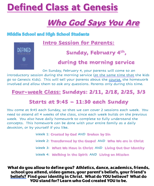 One of the core values of Genesis is that families are important. To live that out, Genesis partners with parents to disciple their families. Terry Lancaster is teaching a Defined Class for Youth starting with a parent meeting during the Feb. 4 worship service. See Travis Dierker or Terry Lancaster for questions.